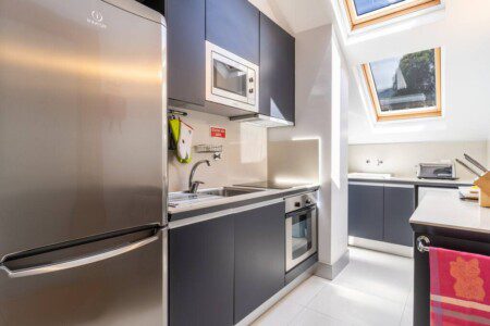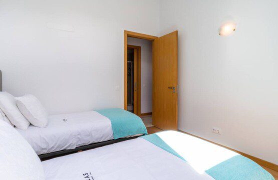 Une chambre avec lit king size et salle de bain avec douche, chambre à deux lits, salon avec canapé-lit pour 2 adultes, cuisine entièrement équipée avec lave-linge, lave-vaisselle, réfrigérateur, four, plaque de cuisson, salle de bain avec douche, balcon avec vue sur la mer et la baie de Funchal , barbecue et accès à la piscine de l'immeuble.